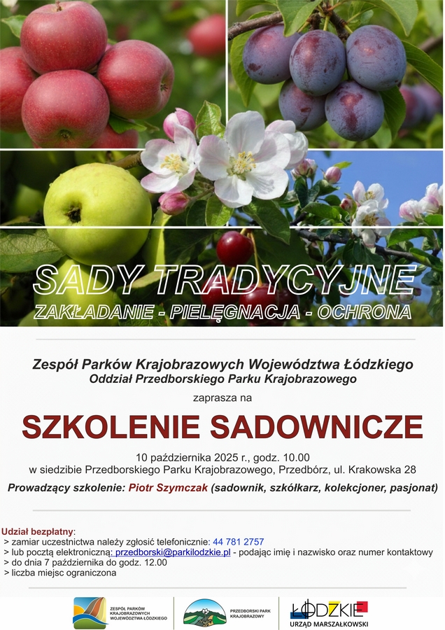 Zespół Parków Krajobrazowych Województwa Łódzkiego, Oddział Przedborskiego Parku Krajobrazowego, ma zaszczyt zaprosić na bezpłatne szkolenie sadownicze, poświęcone tradycyjnym sadom owocowym.