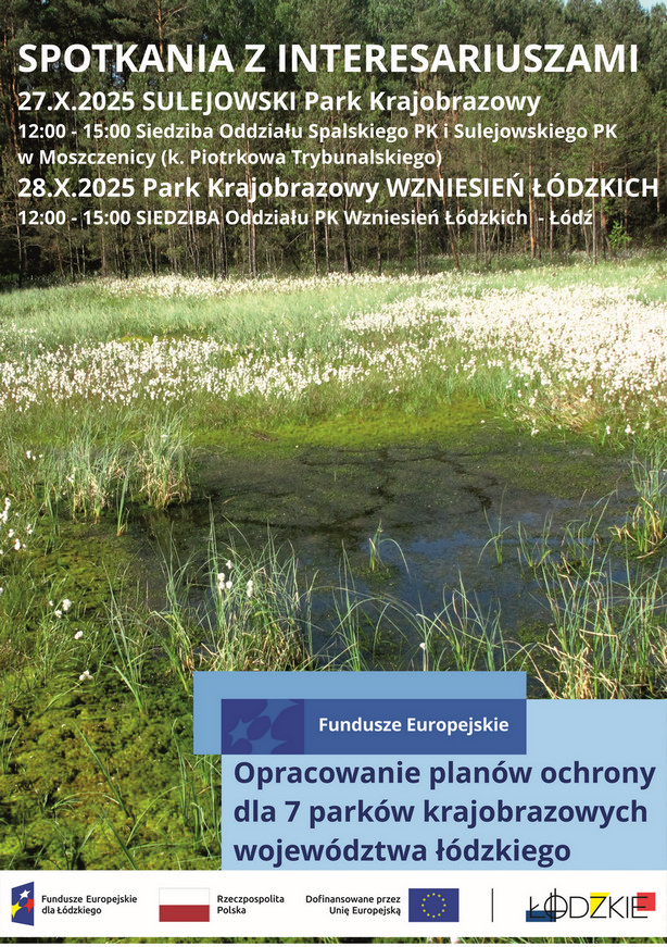 W ślad za wcześniejszymi informacjami o przystąpieniu do sporządzania Planu ochrony dla Parku Krajobrazowego Wzniesień Łódzkich i Sulejowskiego Parku Krajobrazowego zapraszamy do udziału w pierwszych spotkaniach interesariuszy ww. Planów Ochrony, podczas których przedstawione zostaną najważniejsze założenia prac nad tymi dokumentami oraz wstępne wyniki etapu diagnozy stanu.