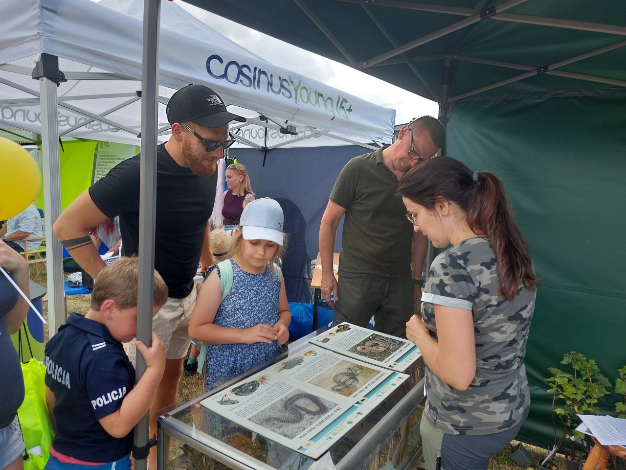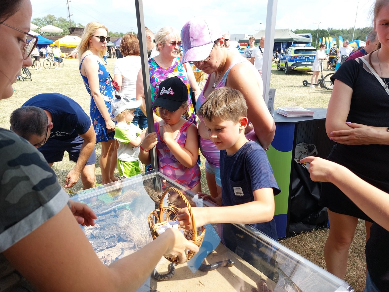 Ponadto uczyliśmy o gadach występujących w Bolimowski Parku Krajobrazowym – jak je rozpoznać, czy są niebezpieczne, gdzie żyją i jak zachować się w przypadku ugryzienia przez jadowitą żmiję zygzakowatą. Kącikowi o wężach towarzyszyła również gablota z modelami poszczególnych gatunków gadów jak i plansze edukacyjne. Zaskoczeniem dla wielu uczestników pikniku było występowanie w naszym rejonie zagrożonego wyginięciem gniewosza plamistego.