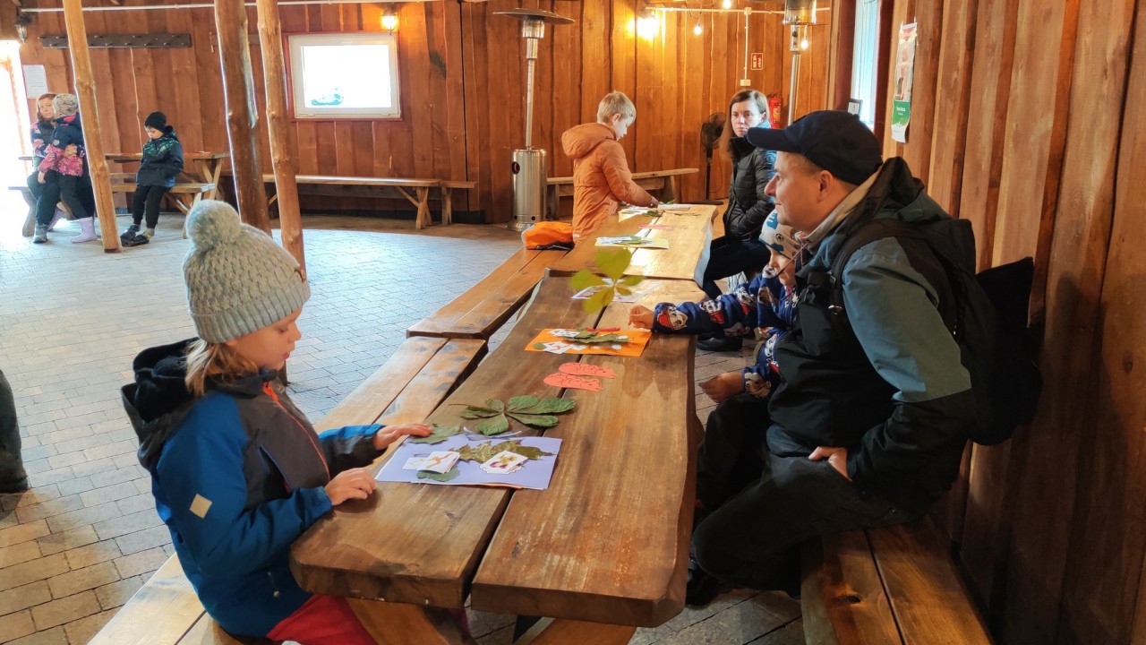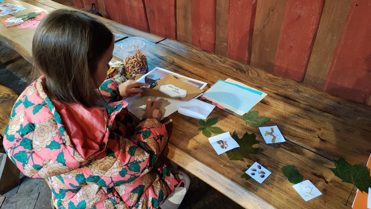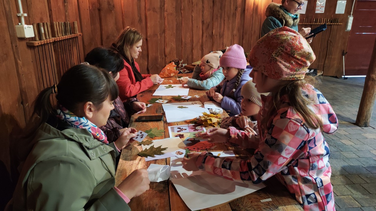 Po powrocie na Sielską Stanicę w Budach Grabskich, rozpoczęliśmy część warsztatową zajęć. Rodziny usiadły do stołów i utrwalały wspólnie wiedzę, tworząc zielnik oraz prace plastyczne z zebranych liści. Na koniec spotkania czekało na wszystkich ognisko i ciepły poczęstunek.
