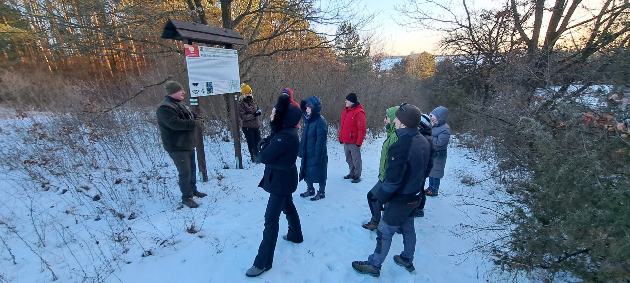 Naszą wędrówkę zakończyliśmy w wyjątkowej oprawie. Zimowe, zachodzące słońce oblało krajobraz rezerwatów głęboką, pomarańczowo-czerwoną barwą, podkreślając surowe piękno Przedborskiego Parku Krajobrazowego.
